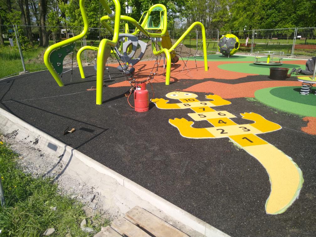 V parku Mezivodí probíhá dokončování nového dětského hřiště, dnes a zítra dojde k položení poslední barevné vrstvy, hmota musí dostatečně vytuhnout. V příštím týdnu ještě proběhne revize ploch a herních prvků a poté bude demontováno oplocení i dosypá