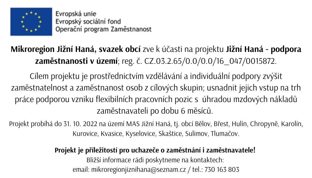 Mikroregion Jižní Haná, svazek obcí zve k účasti na projektu Jižní Haná - podpora zaměstnanosti v území; reg.č. CZ.03.2.65/0.0/0.0/16_047/0015872.