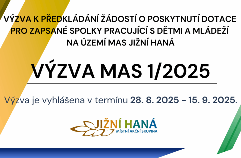 vyhlášeníVýzvy MAS 1/2025 k předkládání Žádostí o poskytnutí dotace pro zapsané spolky pracující s dětmi a mládeží na území MAS Jižní Haná. Příjem Žádostí o dotaci probíhá od dnešních 12 hodin do 15. 9. 2025 ve 12 hodin.