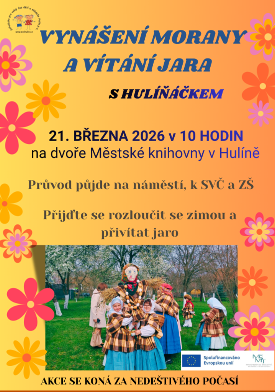 Přijďte se rozloučit se zimou a přivítat jaro. Průvod půjde od Městské knihovny v Hulíně přes náměstí, okolo SVČ HULÍN a ZŠ. Akce se koná jen za nedeštivého počasí.