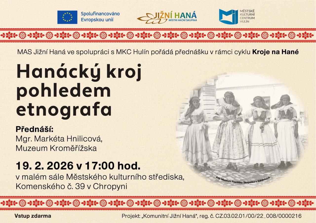 MAS Jižní Haná ve spolupráci s MKC Hulín pořádá přednášku Hanácký kroj pohledem etnografa v rámci cyklu Kroje na Hané, která se uskuteční 19. 2. 2026 v 17:00 hod. v malém sále Městského kulturního střediska v Chropyni (Komenského č. 39 Chropyně).