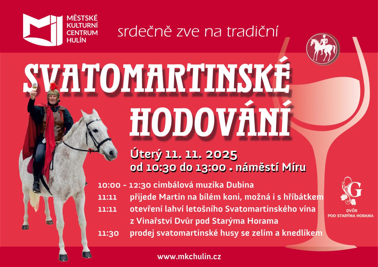 MKC Hulín srdečně zve na tradiční SVATOMARTINSKÉ HODOVÁNÍ, které proběhne v úterý 11. 11. 2025 od 10:30 do 13:00 na náměstí Míru v Hulín.